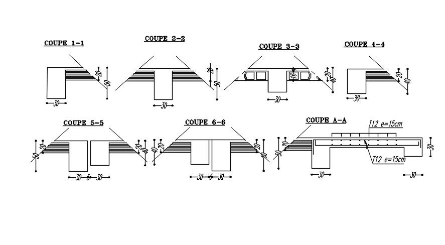 Cross sections of slab with formwork and reinforcement details in AutoCAD 2D drawing, CAD file, dwg file