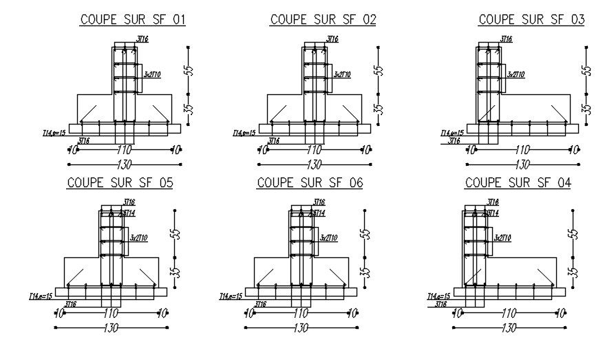 Design of footing sections with reinforcement details in AutoCAD 2D drawing, CAD file, dwg file