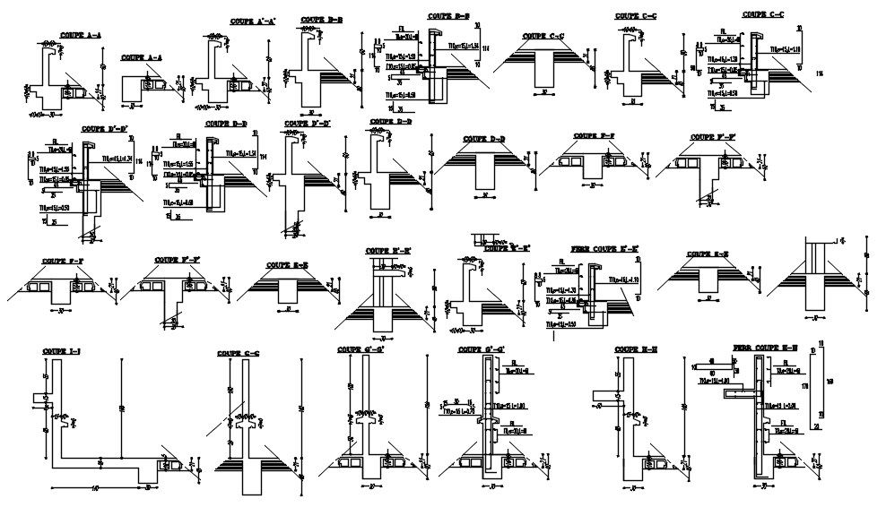 Different cross sections of coping with formwork and reinforcement details in AutoCAD 2D drawing, CAD file, dwg file