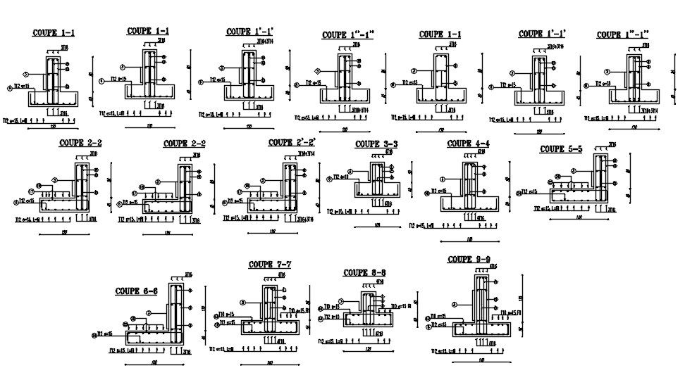 CAD drawing of different sections of footing with reinforcement details, AutoCAD 2D drawing, dwg file