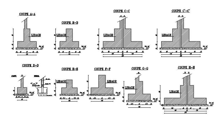 AutoCAD 2D drawing of different designs of footing with details, CAD file, dwg file