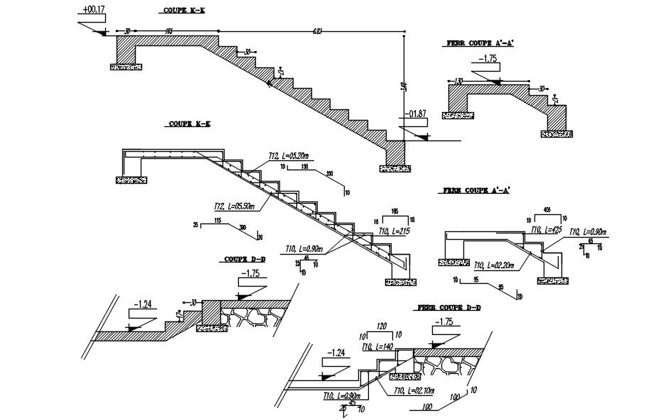 This architectural drawing is Formwork and reinforcement details of the staircase of the ground floor in AutoCAD 2D drawing, CAD file, and dwg file. For more details and information download the drawing file.