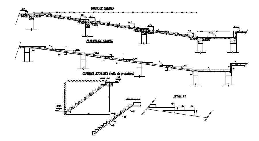 Reinforcement and formwork details of the stairs in AutoCAD 2D drawing, CAD file, dwg file