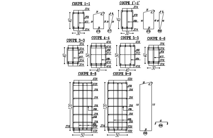 Reinforcement details of the different structures sections in AutoCAD 2D drawing, CAD file, dwg file