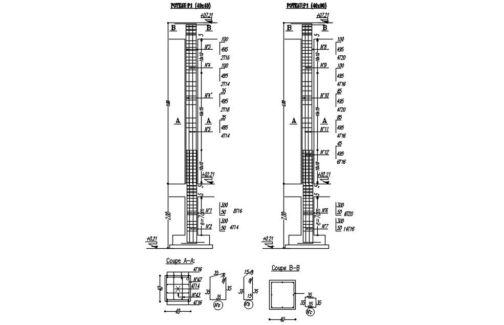 2D design of Cross section A and B of the column with reinforcement details in AutoCAD drawing, CAD file, dwg file