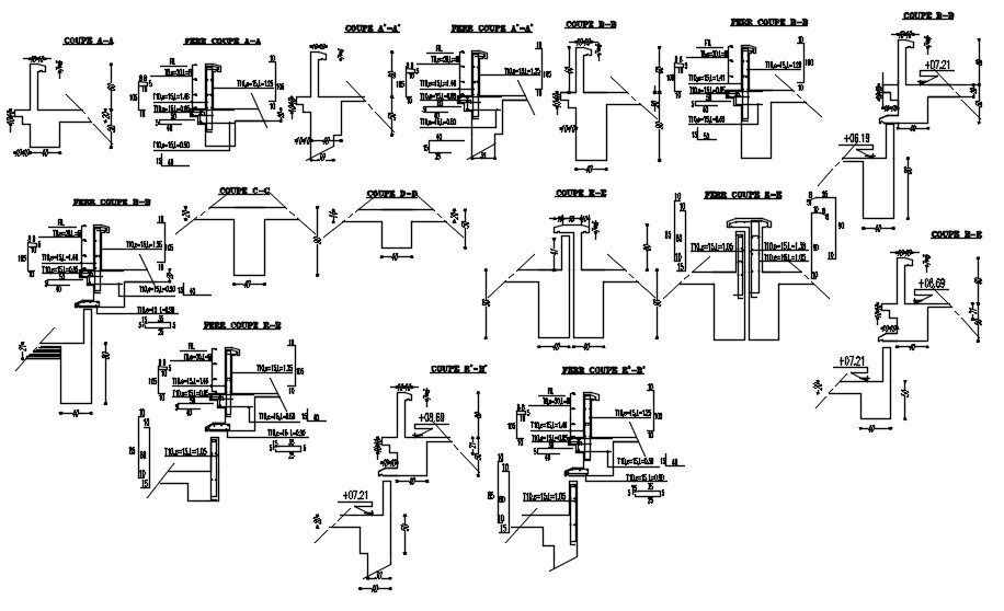 This architectural drawing is Different cross sections of the coping structure with formwork and reinforcement details in AutoCAD 2D drawing, CAD file, and dwg file. For more details and information download the drawing file.