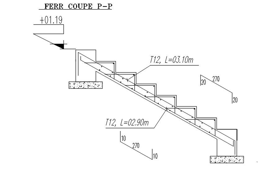 This architectural drawing is Cross section P-P of the staircase with reinforcement details in AutoCAD 2D drawing, CAD file, and dwg file. The concrete steps must be strengthened with steel bars so that they can carry the weights that come down the stairs and transfer them to the ground. A structural engineer will determine the number of steel bars and their sizes based on the loads that will be applied to the stairs. For more details and information download the drawing file.
