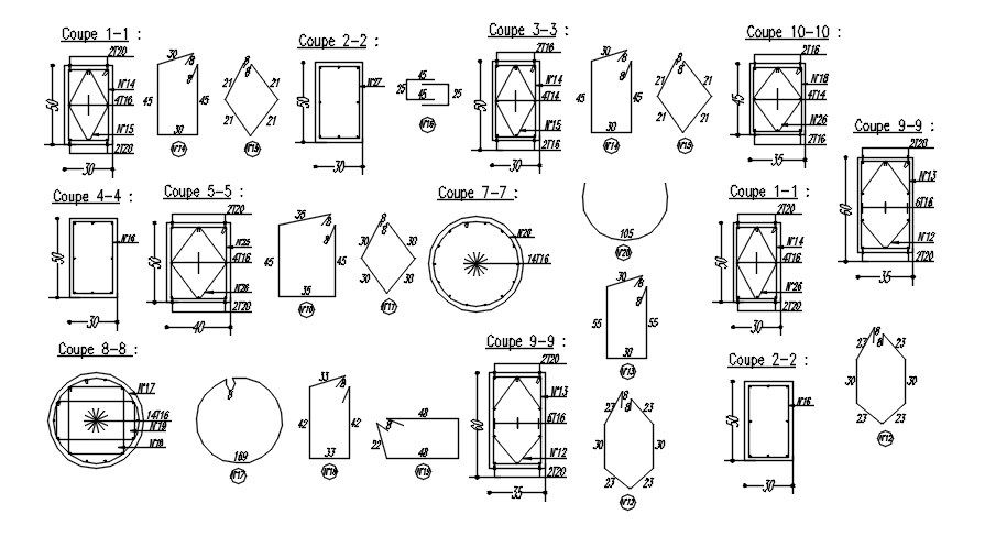 Cross sections 1 to 9 of different shapes of columns with reinforcement details in AutoCAD 2D drawing, CAD file, dwg file