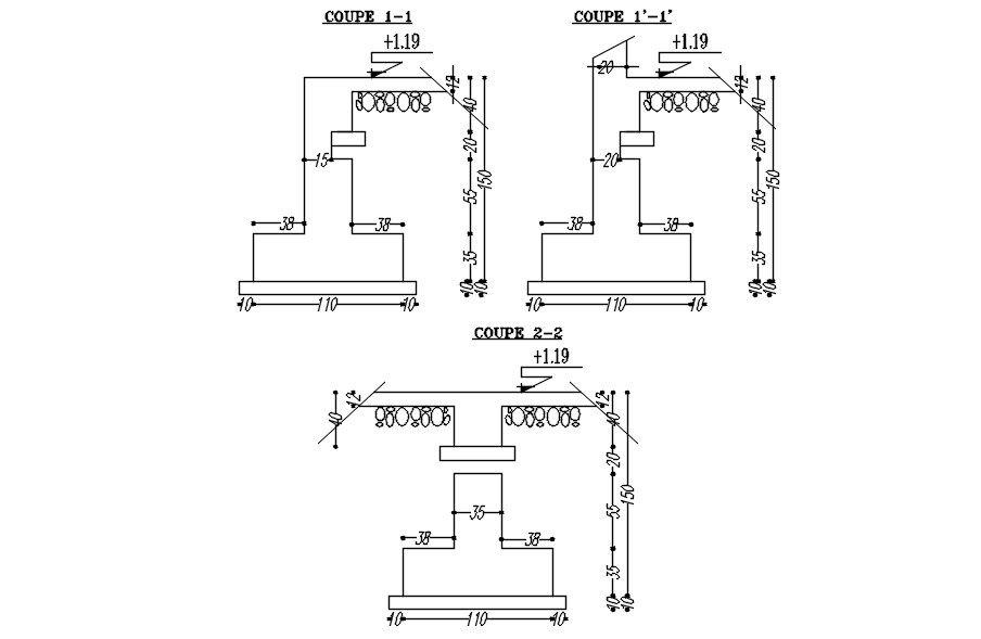 This architectural drawing is a Footing structure below the ground level design in AutoCAD 2D drawing, CAD file, and dwg file. In this drawing sections 1-1, 1'-1', and 2-2 are given. Size of the all sections is 130x150 given. For more details and information download the drawing file.