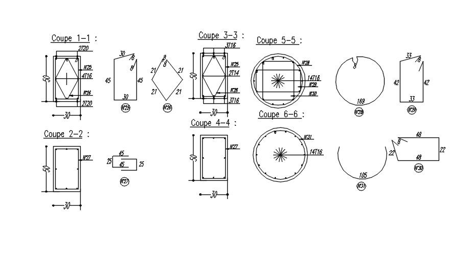 This layout is a structural component of the reinforcement cross-section bar. Her mentioned coupe 1-1, 2-2,3-3,4-4 is square design, and 5-5,6-6 is circular design. Coupe 1-4 length=30, height=50 & section 5-6 circular section with dia 169,150. For more details information visit our pages and Download the 2D Autocad files.