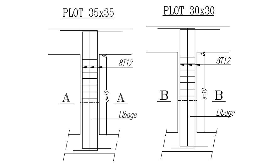 This is an architectural plan layout of the reinforcement footing foundation Autocad Drawing file. Here we mention PLOT35*35 of A-section &B -section 30*30 both e=10 used T8. For more details information check the pages of cadbull.com & Download the 2DAutocad DWG file.