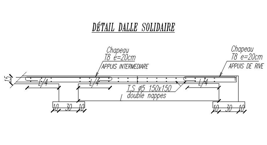 This architectural drawing is the 2D design of reinforcement details of the slab in AutoCAD drawing, CAD file, and dwg file. In this drawing slab thickness is 15 given. T.S. dia. 5 150x150 reinforcement bars are used. Further, For more detailed information visit our pages and Download the 2D Autocad DWG file.
