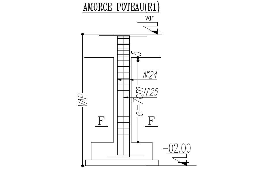 This architectural drawing is the 2D design of the Reinforcement footing single bar cross-section line plan layout in AutoCAD drawing, CAD file, and dwg file. In this drawing section F-F is given. For more details information check the pages of cadbull.com & Download the 2DAutocad DWG file.
