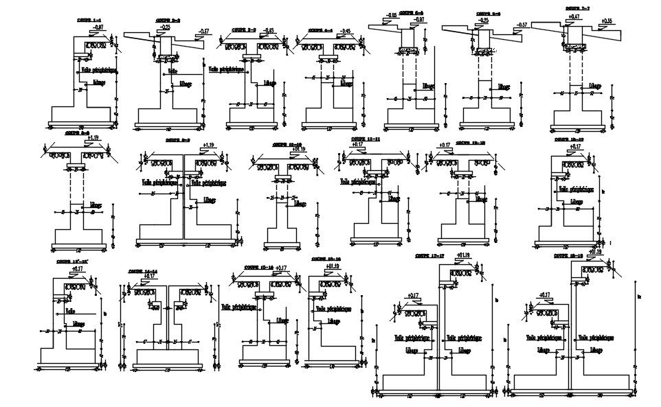 This architectural drawing is a 2D drawing of the footing structure below the ground level in AutoCAD, CAD file, and dwg file. Here sections 1-1 to 18-18 with different ways of footing categories are mentioned with all clear dimensions. For more details information visit our pages and Download the Autocad DWG file.