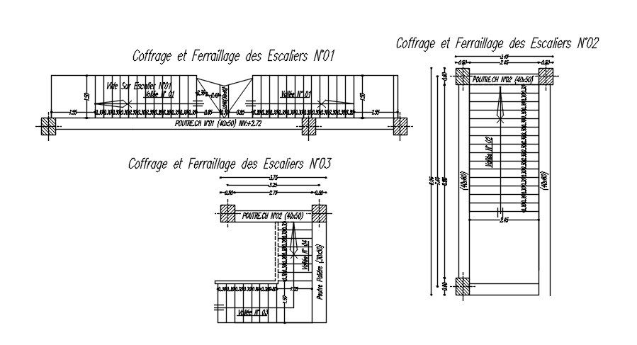 This architectural drawing is Formwork and Reinforcement of Stairs design in AutoCAD 2D drawing, CAD file, dwg file. In this drawing sections N°01, N°02, and N°03 of the stairs are given with details and dimensions. For more details information check the pages of cadbull.com & Download the 2D Autocad DWG file.