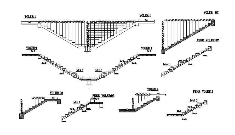 This architectural drawing is the 2D design of Formwork and Reinforcement of Stairs in detail AutoCAD drawing, CAD file. In this drawing, 4 sections of the stairs are given with details and dimensions. For more details information check the pages of cadbull.com & Download the 2D Autocad DWG file.