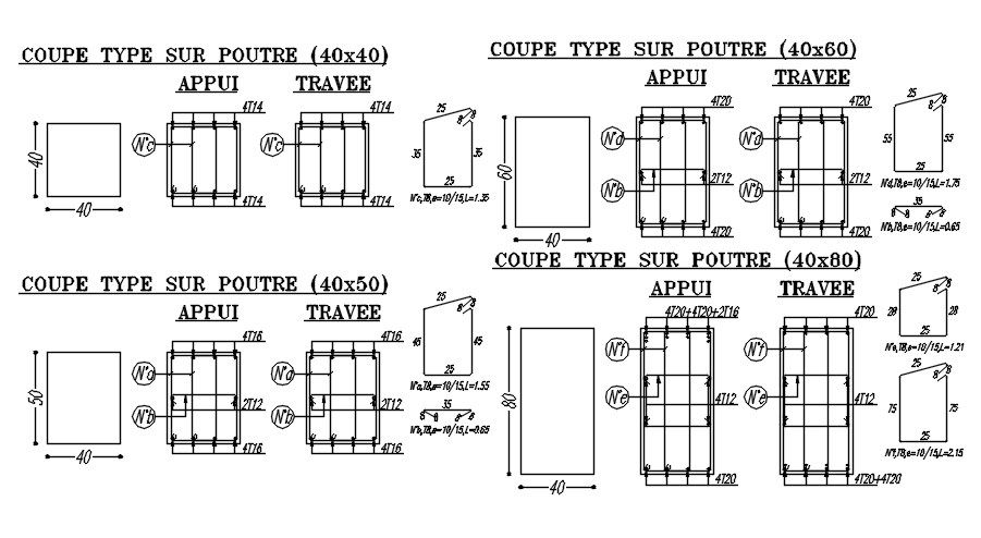 This architectural drawing is TYPICAL SECTIONS OF BEAM design with details in AutoCAD 2D drawing, CAD file, and dwg file. In this drawing, Different sizes of sections like 40x40, 40x50, 40x60, and 40x80 are given with details and dimensions. For more details information visit our pages and Download the Autocad DWG file.