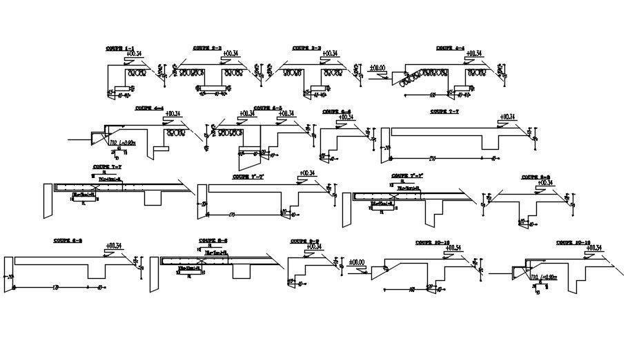 This architectural drawing is the Foundation footing component layout plan design and all section coffrage structure in AutoCAD 2D drawing, CAD file, dwg file. Sections 1-1, 2-2, 3-3, 4-4, 4'-4', 5-5, 6-6, 7-7, 7'-7', 7"-7", 8-8, 8'-8', 8"-8", 9-9, 10-10 are mentioned in this drawing. For more details information visit our pages and Download the Autocad DWG file.