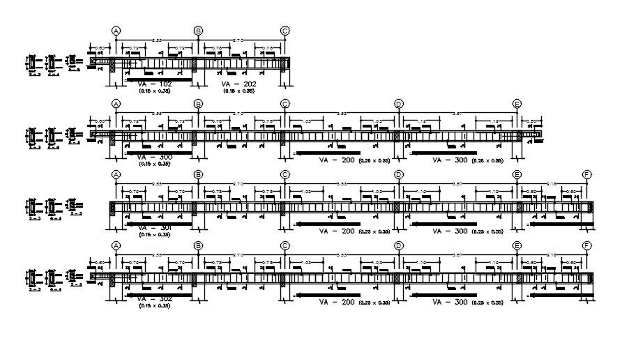 This architectural drawing is the 2D design of different sections of the beam with reinforcement details in AutoCAD 2D drawing, CAD file, and dwg file. There were sections 3-3, 4-4, and 5-5 are mentioned. A to F sections of the beam is given. Length of A-B is 2.55, B-C is 2.70, C-D is 3.53, D-E is 3.57 and E-F is 2.18 given. For more detailed information visit our pages and Download the 2D Autocad DWG file.