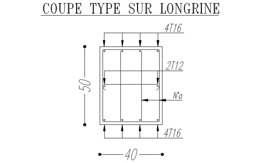 This architectural drawing is a TYPICAL SECTION ON SIEGE design with detail in AutoCAD 2D drawing, CAD file, and dwg file. The size of the sections is 40x50 given. 4T16 and 2T12 reinforcement bars are mentioned. For more detailed information visit our pages and Download the 2D Autocad DWG file.