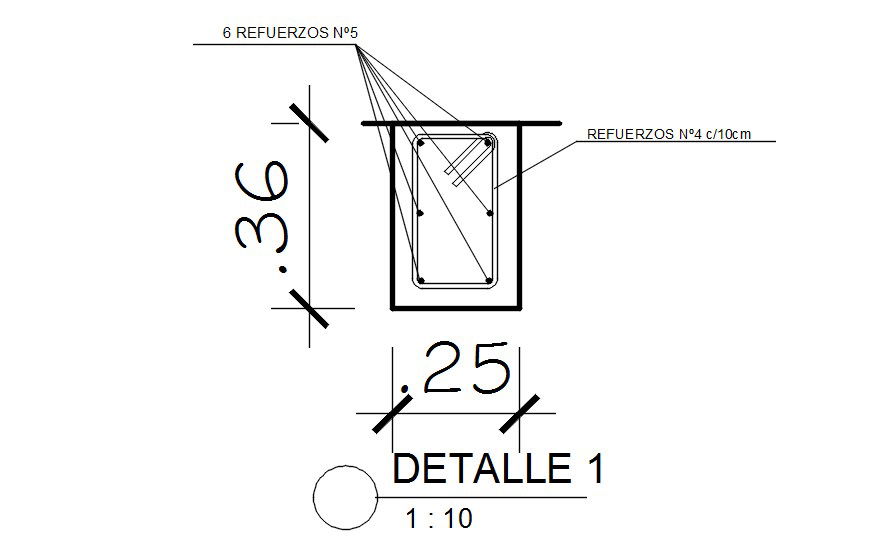 This architectural drawing is a 0.25x0.36m sized cross-section of the beam with reinforcement details in AutoCAD 2D drawing, CAD file, and dwg file. REINFORCEMENTS Nº4 c/10cm, 6 REINFORCEMENTS Nº5 are mentioned in this drawing. For more detailed information visit our pages and Download the 2D Autocad DWG file.