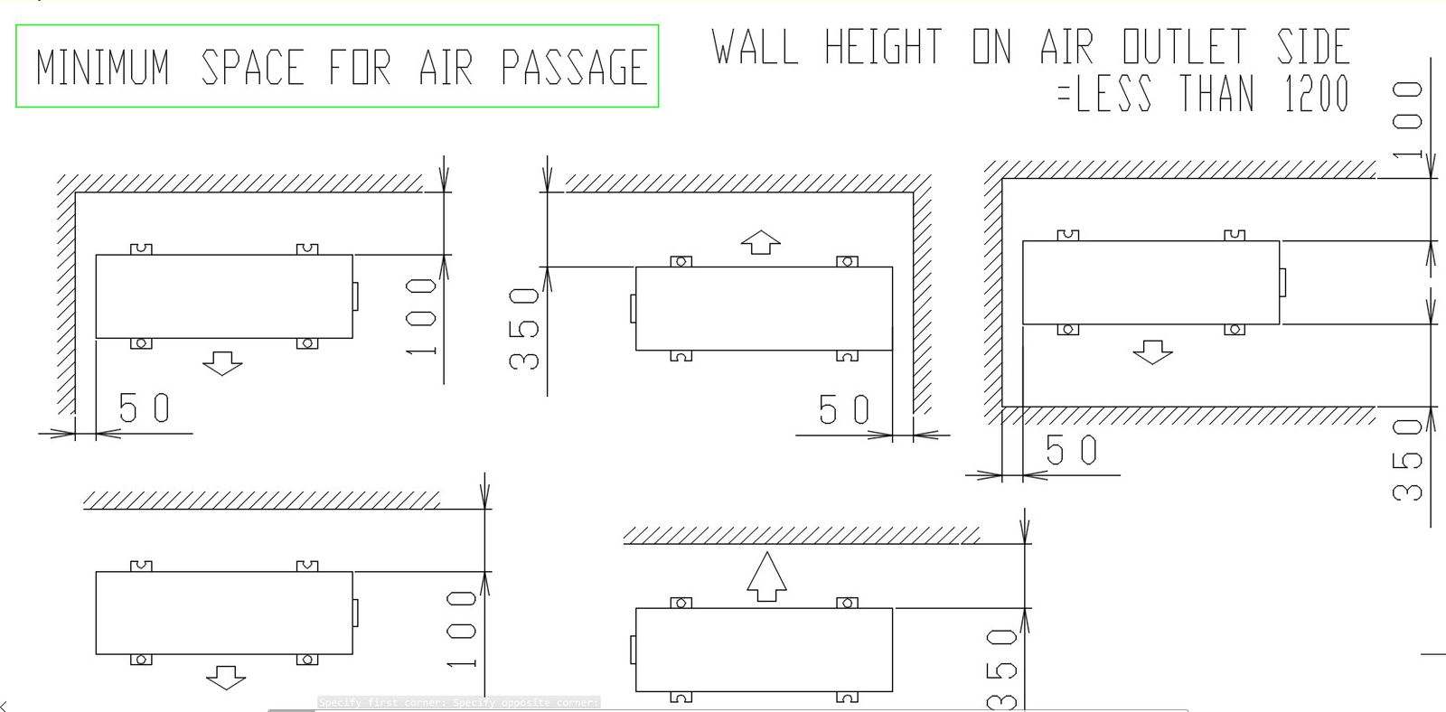 2D design of minimum space for air passage in an Air conditioner in AutoCAD drawing. wall height on the air outlet side is less than the 1200 mentioned. For more detailed information visit our pages and Download the 2D Autocad DWG file.