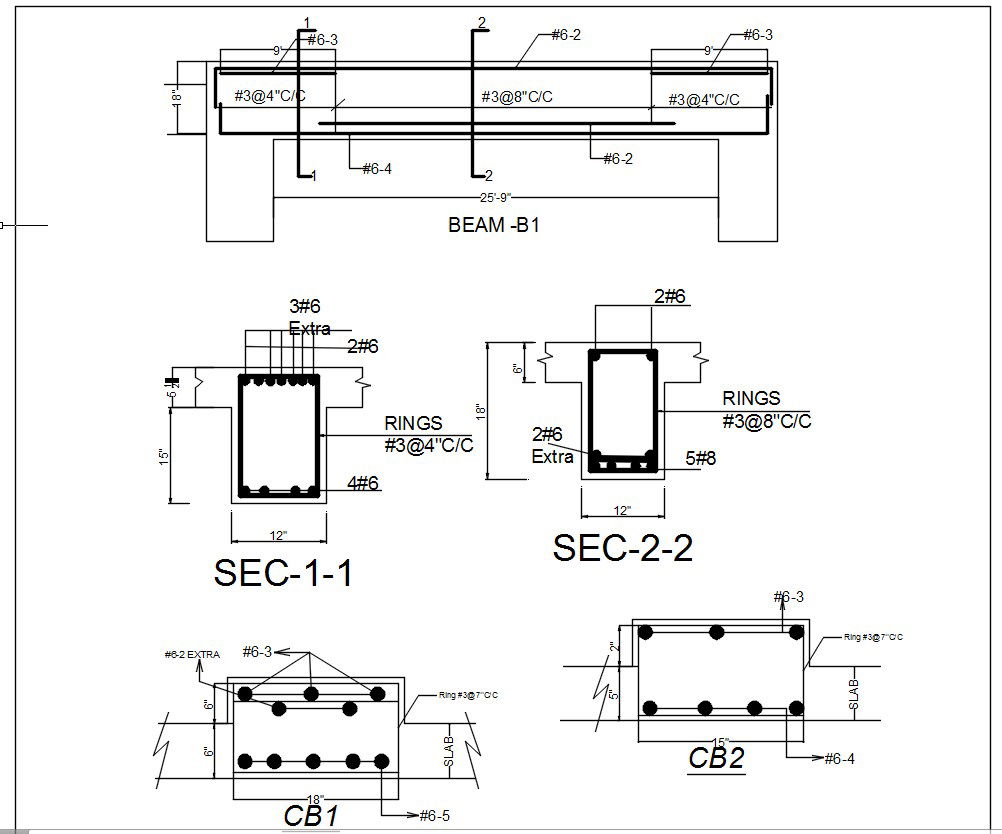 This structural drawing is Reinforcement and rings detail of the Beam B-1 design in AutoCAD 2D drawing, CAD file, and dwg file. Section 1-1, section 2-2, CB1 and CB2 are given with dimension details. For more detailed information visit our pages and Download the 2D Autocad DWG file.