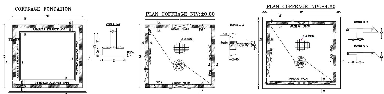 Coffrage foundation plan and sections detail design in AutoCAD drawing, CAD file, dwg file