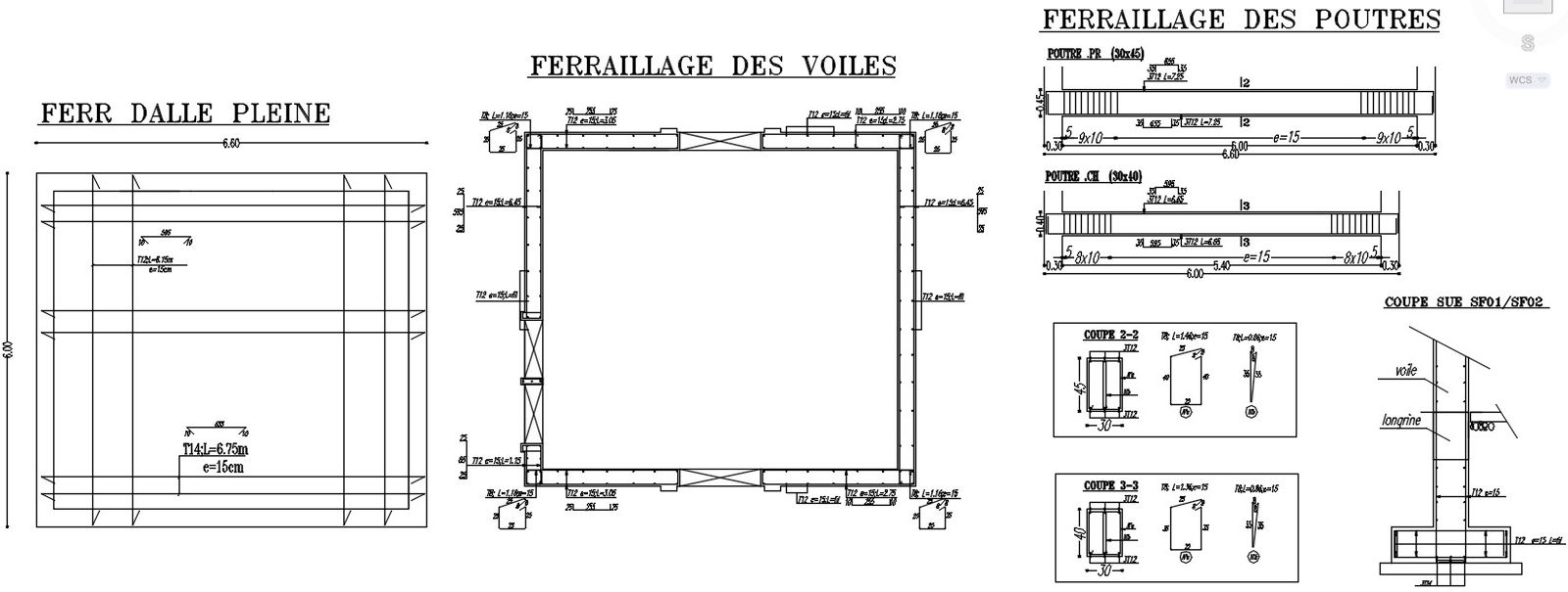 This architectural drawing is Reinforcement details of slab, wall, and beams design with details in AutoCAD 2D drawing, CAD file, and dwg file. slab size is 6.00x6.00 given. T12, L=6.15m, e=15cm given. Cross sections 2-2, and 3-3 are given in this drawing. For more detailed information visit our pages and Download the 2D Autocad DWG file.