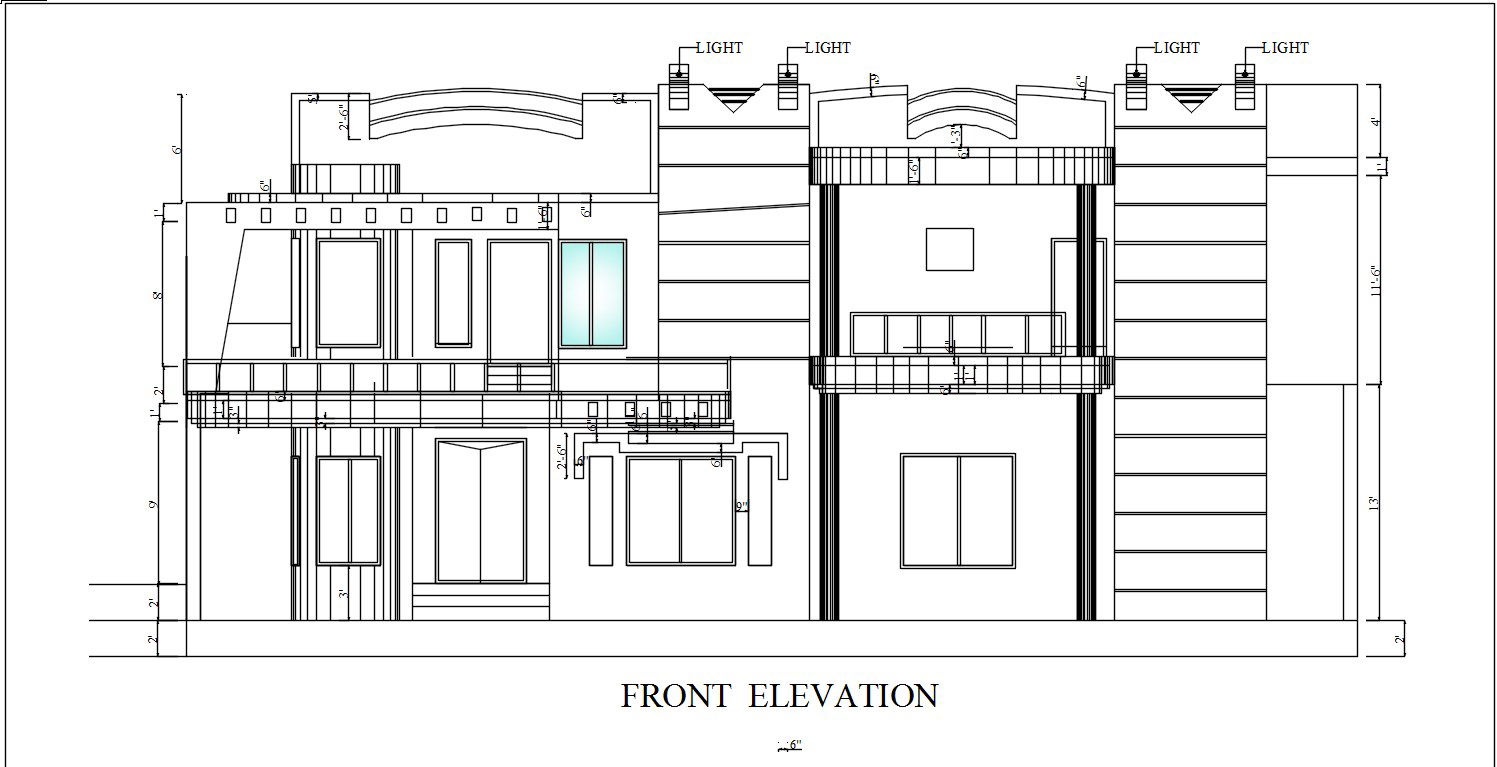 This architectural drawing is the 2D drawing of the front elevation of the house in AutoCAD, CAD file, dwg file. Dimension details are also given in this drawing. For more detailed information visit our pages and Download the 2D Autocad DWG file.