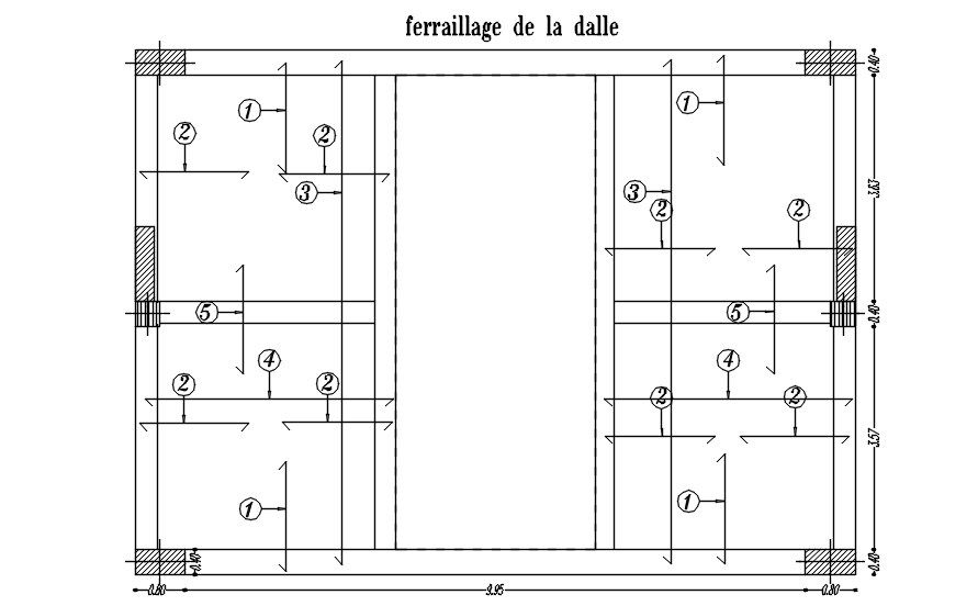 Reinforcement of the slab details design in AutoCAD drawing. no.1 to 5 of the reinforcement details is specified in the drawing. For more detailed information visit our pages and Download the 2D Autocad DWG file.