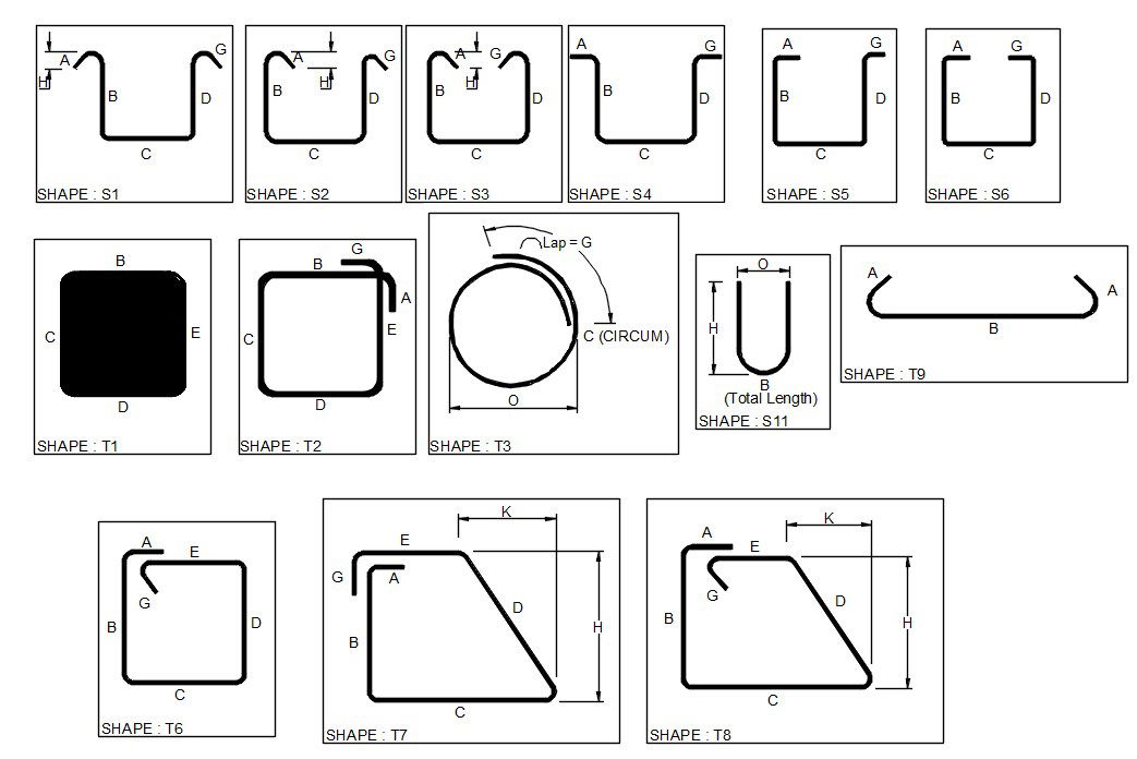 Different reinforcement shapes were design in AutoCAD 2D drawing. Shapes S1, S2, S3, S4, S5, S6, S11, T1, T2, T3, T6, T7, T8 and T9 of the reinforcement are given with details. For more details and information download the drawing file.