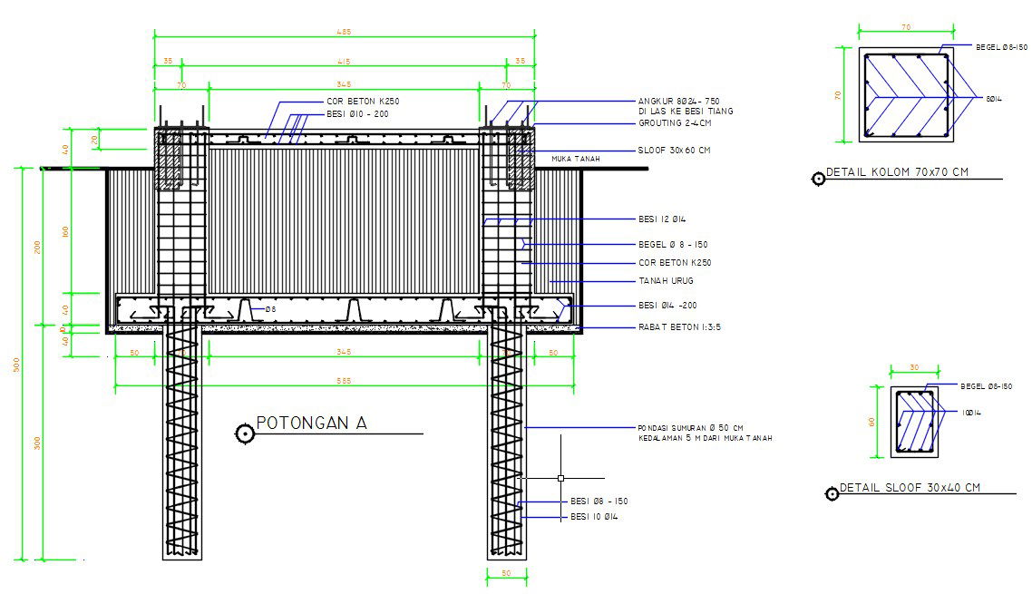 2D drawing of Cross section A of the structure and column and sloof section details, CAD file, dwg file