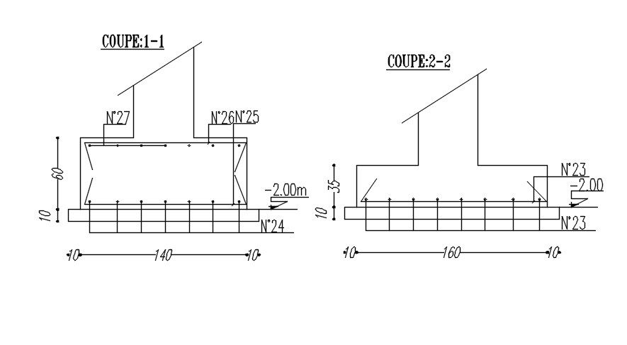 Cross section 1-1 and 2-2 of the footing with reinforcement details in AutoCAD drawing, CAD file, dwg file