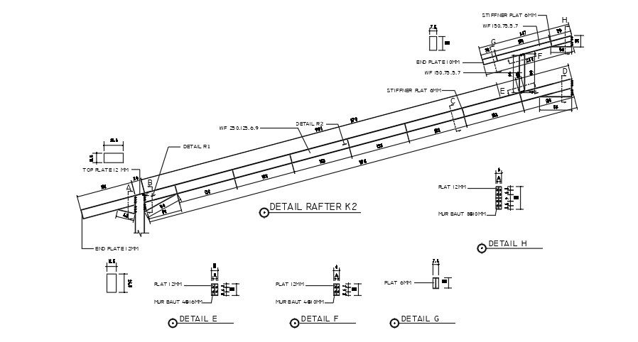 A rafter 2d detail drawing is given in this file. The length of the rafter is 1178mm. 6mm thickness of the stiffener plate is used. 12mm thickness of the top plate is used. The rafter is used for slope structural members as a beam that extends from the ridge or hip to the wall plate. The rafter is designed to support the roof shingles, roof deck, and associated loads.
