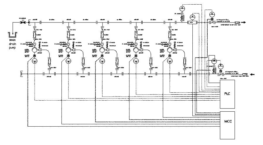 2D water drain pump detail drawing is given in this file. Inlet and outlet details are given. In this plumbing layout, 5 water line pipes are provided. In this process, water has taken from the drain pump and runs through the pipelines, and is taken to the water outlet to network tone. For each connection, the pressure gauge is provided to main the flow level of water.