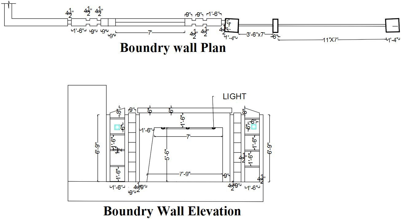 Boundary wall plan and elevation design in AutoCAD 2D drawing. height of the door is 7' given. dimensions details are given in this drawing. For more knowledge and detailed information download the AutoCAD drawing file.