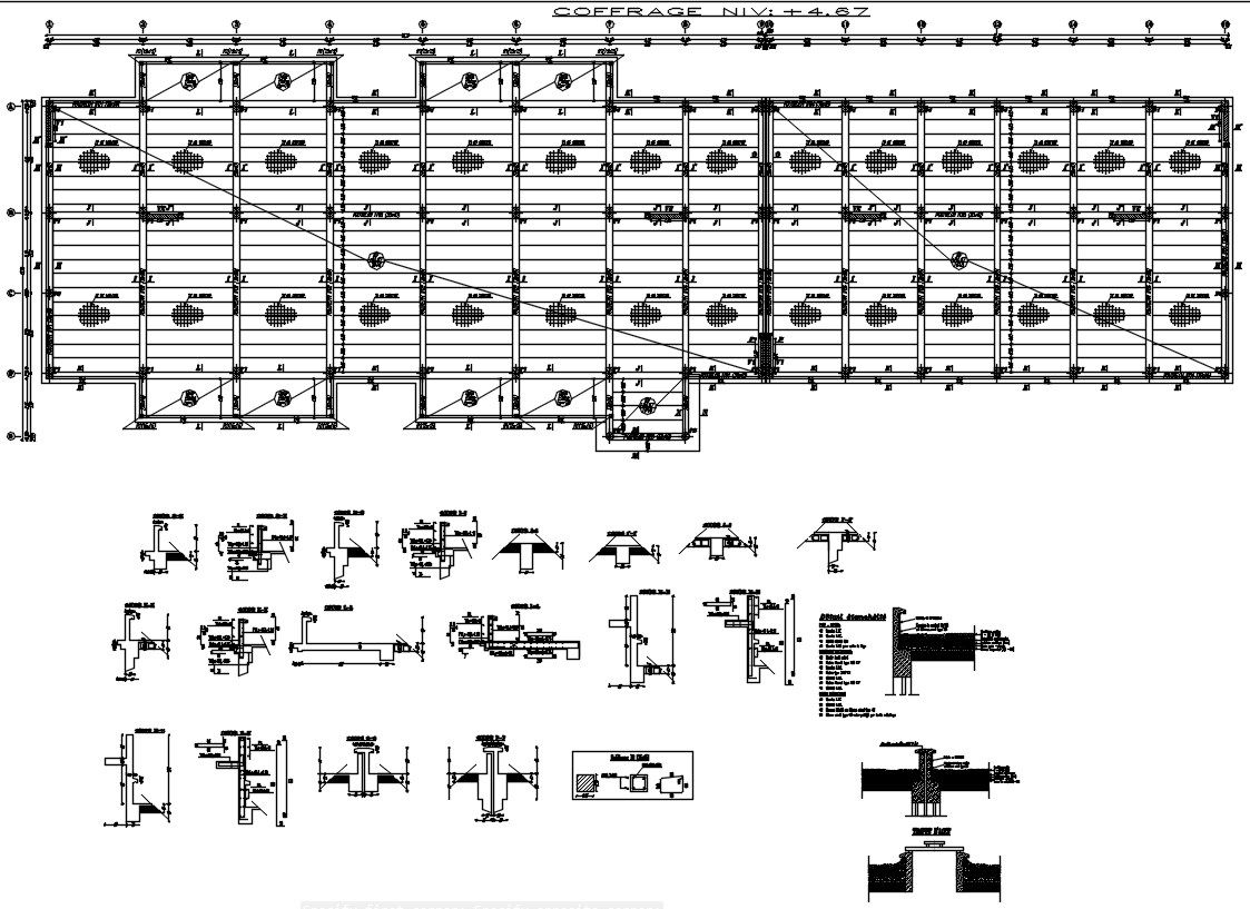 AutoCAD 2D drawing of raft foundation layout plan with reinforcement details. Waterproofing details of the structure are given. Steel components design with reinforcement and formwork details are also given with dimensions. For more knowledge and information download the drawing file.