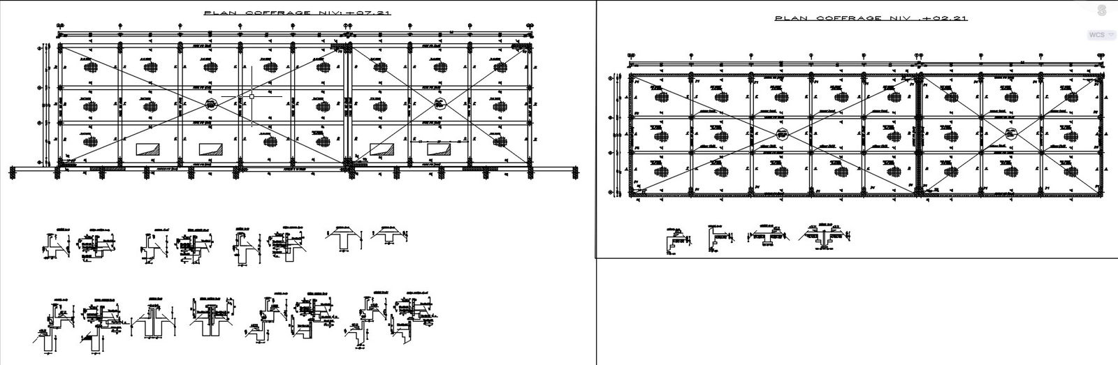 Steel components design and raft foundation layout plan with reinforcement details in AutoCAD 2D drawing. In this drawing, different steel components are designed with formwork, and reinforcement details are given with dimensions. NIV +7.21 and +2.21 are specified in this drawing. For more knowledge and detailed information download the AutoCAD 2D dwg file.