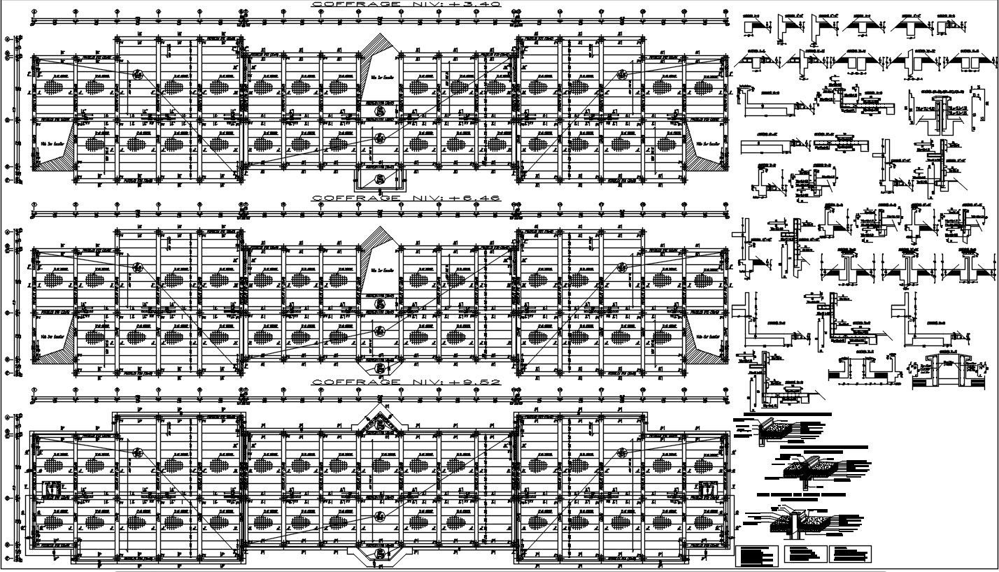 Layout plan of raft foundation with reinforcement details in AutoCAD 2D drawing. NIV +3.40, +6.48, and +9.42 are specified. waterproofing details of the terrace are given. Slab and steel components design with formwork and reinforcement details are also given in this file. For more knowledge and detailed information download the 2D AutoCAD dwg file.