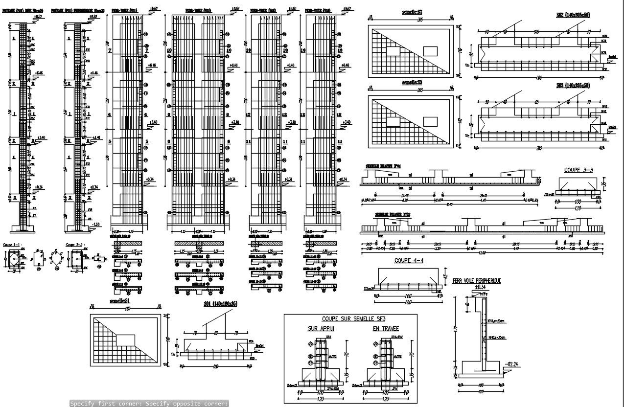 Different foundation structures, wall and pillars design with reinforcement details design in AutoCAD 2D drawing, CAD file, dwg file
