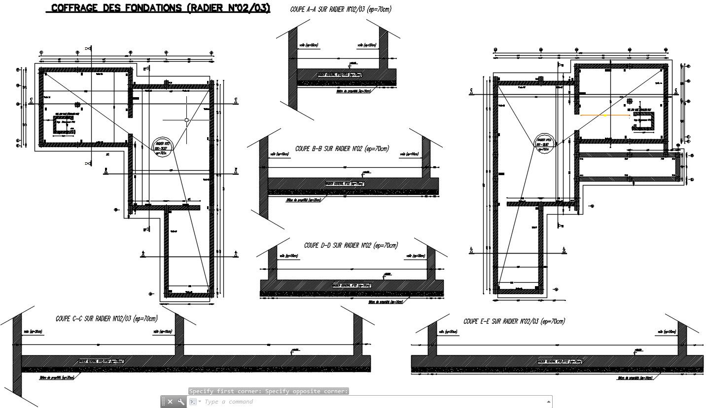 2D drawing of coffrage foundation with formwork details and their different sections design in AutoCAD 2D drawing, CAD file, dwg file