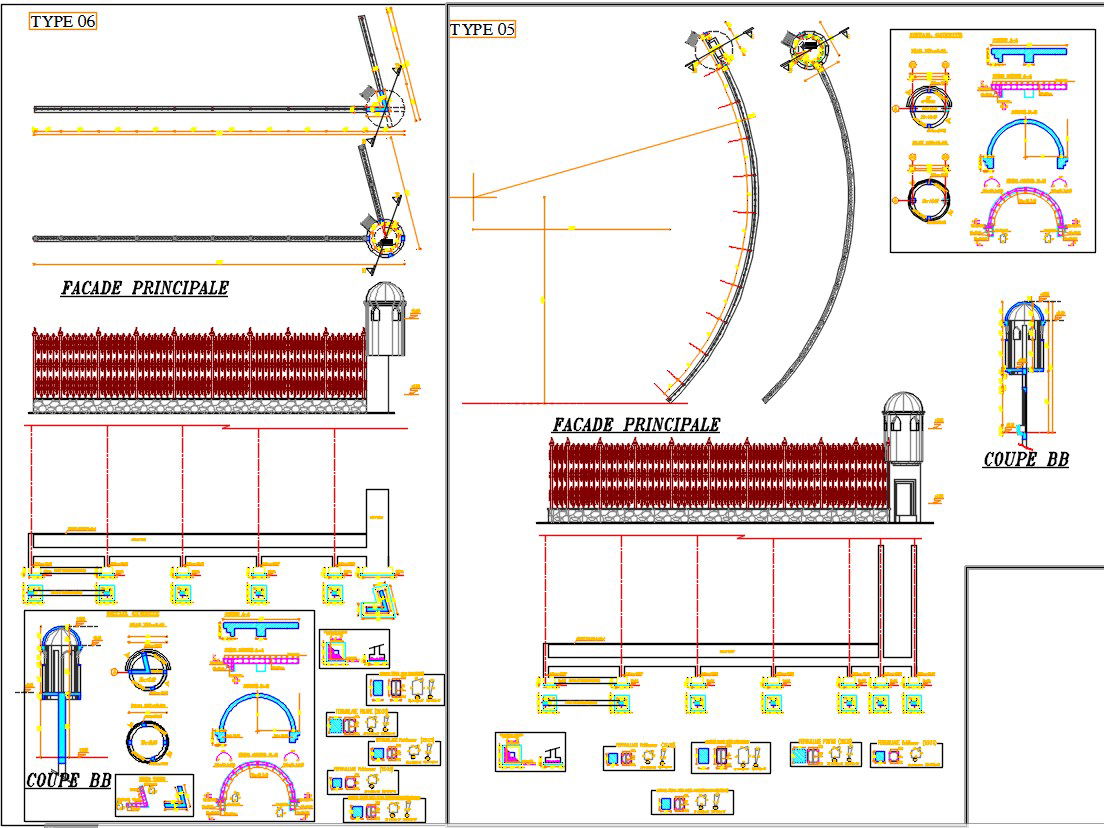 2D drawing of section and elevation of boundary wall with gatehouse structure details in AutoCAD. Gatehouse design is given with formwork and reinforcement details. For more knowledge and detailed information download the 2D AutoCAD dwg file.