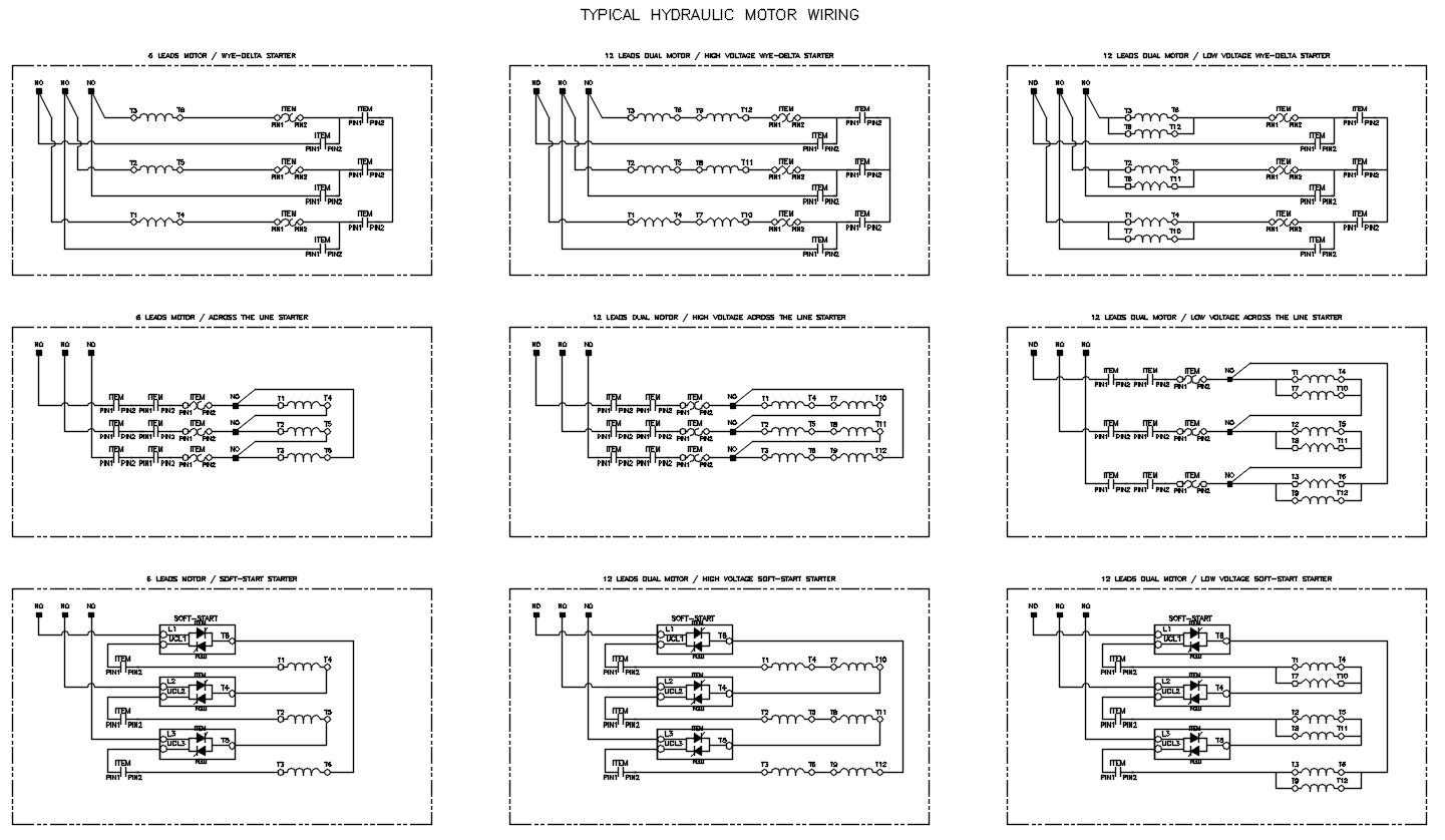 Typical hydraulic motor wiring design in AutoCAD 2D drawing, CAD file. Hydraulic pumps powered by electric motors transform electrical energy into hydraulic power. An AC or DC current drives the electric motor, which rotates a drive shaft. The hydraulic pump, which transforms low-pressure fluid into high-pressure fluid, is connected to the drive shaft. For more knowledge and detailed information download the 2D AutoCAD dwg file.