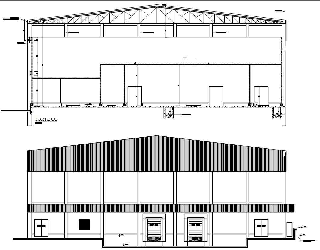 Cross section CC of the factory and elevation plan details in AutoCAD 2D drawing, CAD file, dwg file