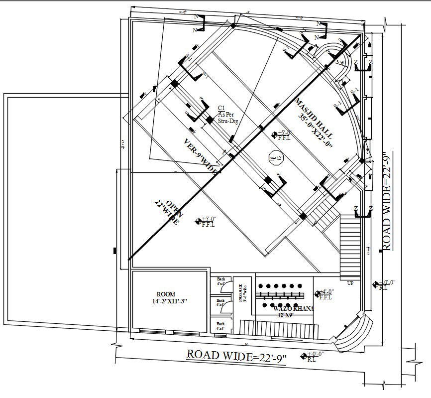 Layout plan of the mosque with details in AutoCAD 2D drawing, CAD file. masjid hall, verandah, open space, room, washrooms, wazo khana, etc. are given with dimension details. For more knowledge and detailed information download the 2D AutoCAD dwg file.
