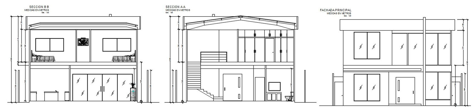 House elevation and different cross sections design in AutoCAD 2D drawing, CAD file. Cross sections A-A and B-B of the house design are given with dimension details. For more detailed information download the 2D AutoCAD dwg file.