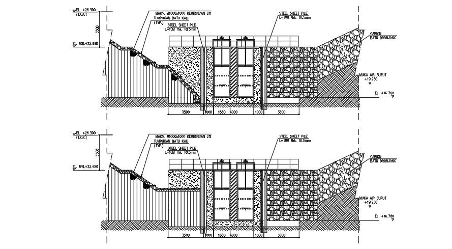 Pile foundation detail drawing is given in this 2D AutoCAD file. Steel sheet pile is provided. The length of the steel sheet is 10mm and the thickness of the steel sheet pile is 10.5mm. Each dimension is given in the mm. Gabion stone is provided.