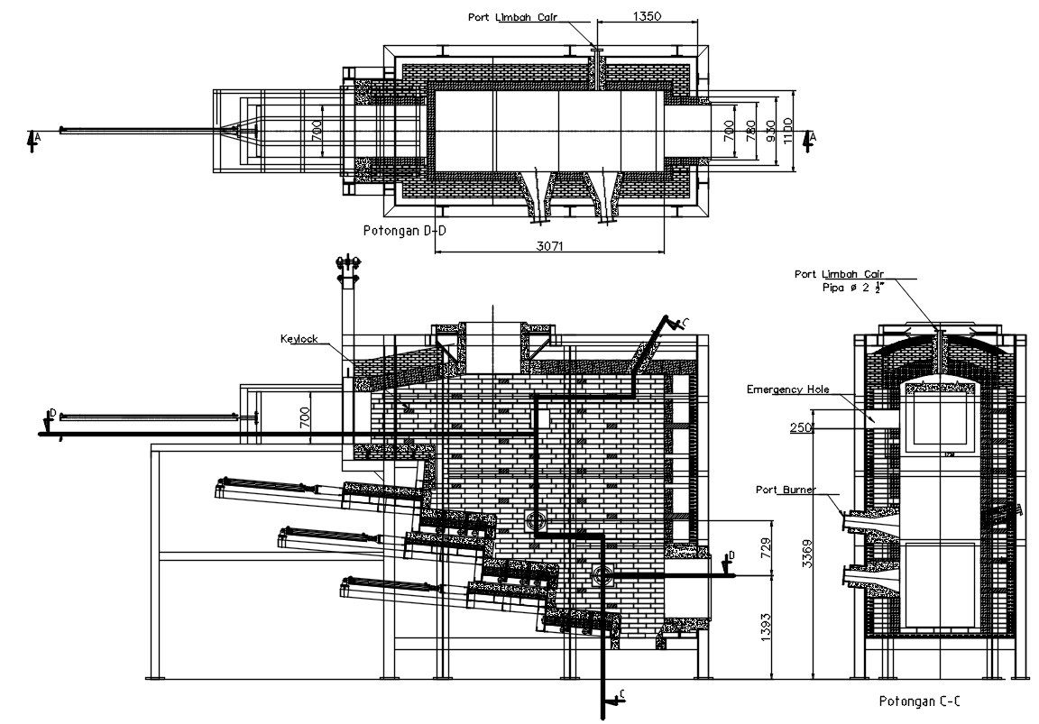 Arrangement of the first chamber of the incinerator design in AutoCAD 2D drawing, CAD file. keylock, burner port, emergency hole, etc. parts are specified and other dimension details are given in this design. For more detailed information download the 2D AutoCAD dwg file.