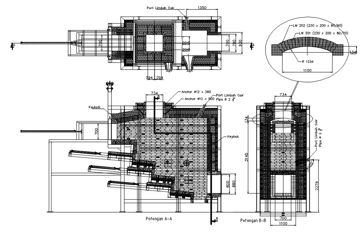 2D design of arrangement of the first chamber of an incinerator in AutoCAD, CAD file. cross sections A-A and B-B of the chamber are given with dimension details. For more detailed information download the 2D AutoCAD dwg file.